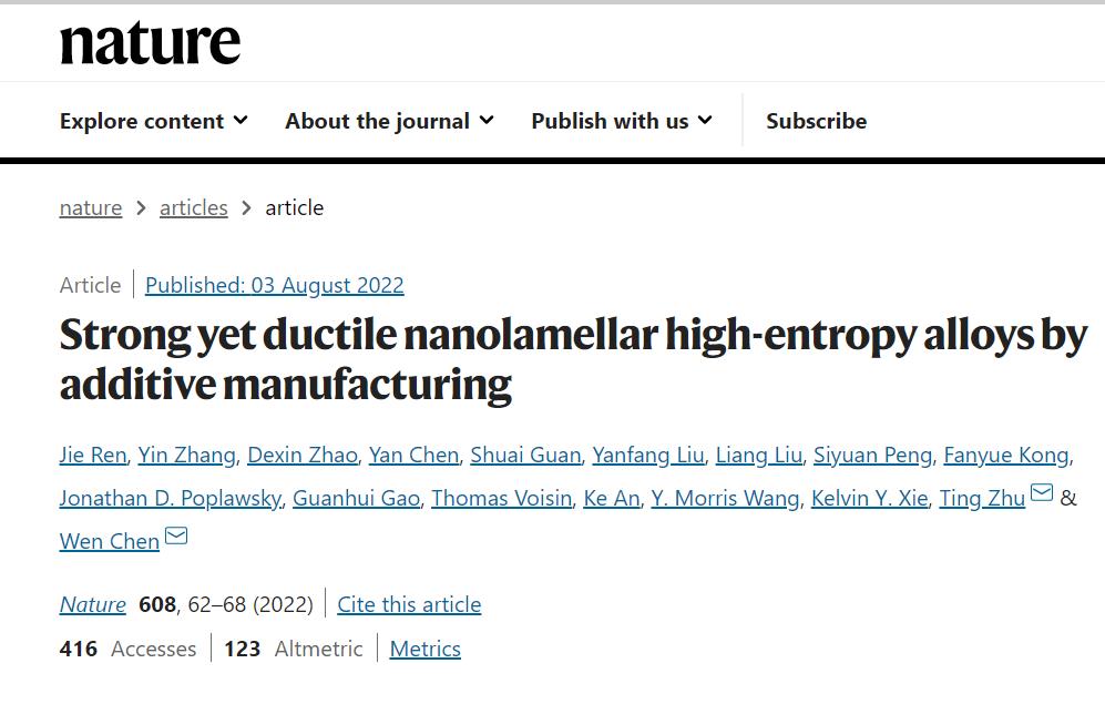 Nature:首款3D打印纳米结构高熵合金问世