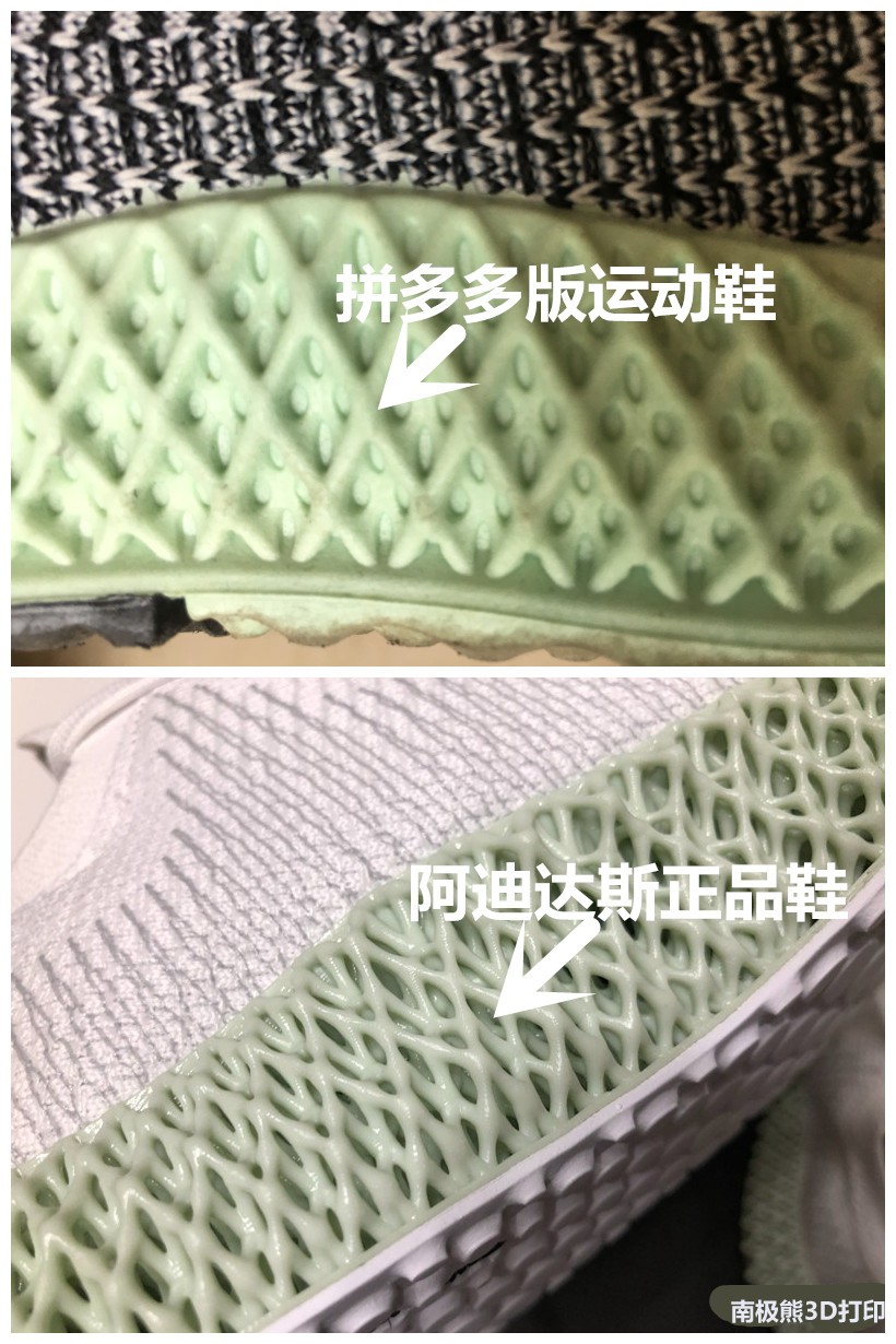 △明显可以看到,拼多多版的运动鞋鞋底是实心的;而阿迪达斯、耐克、匹克等正品的3D打印鞋是空心的网格结构。