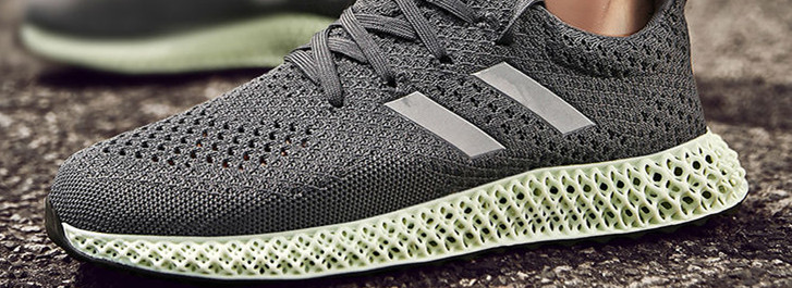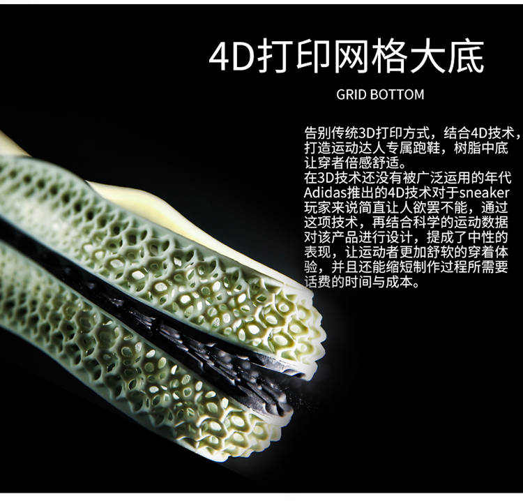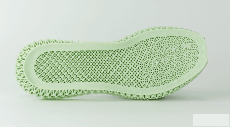 △阿迪达斯3D打印鞋底,采用美国Carbon3d公司的 Digital Light Synthesis高速数字化光固化3D打印技术,采用透氧光学、数字光投射和可编程液体树脂来制造鞋底。