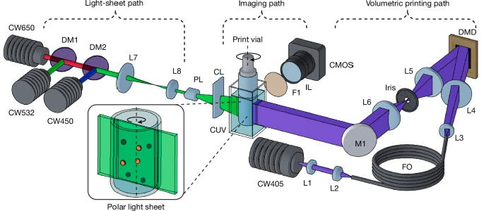 与传统的逐层打印不同,体积生物打印使用由细胞友好型激光激活的光敏凝胶,一步即可形成完整的结构,从而加快打印速度,并减少对细胞的压力。GRACE通过实时扫描凝胶并围绕细胞的实际位置设计结构,进一步推进了这种方法,从而能够构建具有优化血管网络和多层结构的功能性组织。